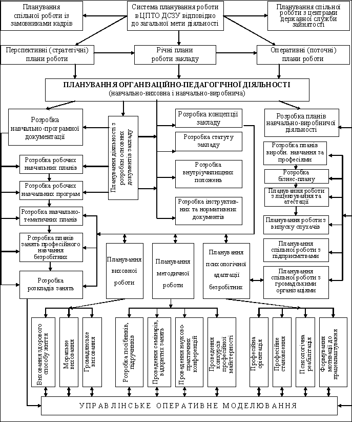 Виклад основного матеріалу. Проаналізовані у зазначених працях наукові та технологічні підходи до моделювання організаційно-педагогічної діяльності, сформульовані на цій основі принципи, правила, вимоги є теоретичним підґрунтям, необхідними положеннями, які завжди випереджають самі процеси (будь-якої діяльності), зокрема і моделювання. Наявність наукових положень щодо планування роботи навчальних закладів як різновиду моделювання стало основою розроблення теоретично обґрунтованої системи планування роботи у професійно-технічних навчальних закладах державної служби зайнятості, яка, на наш погляд, відповідає сучасним вимогам до об’єктів такого рівня.