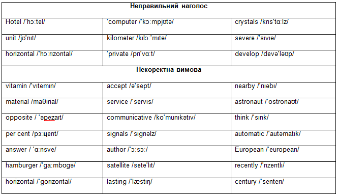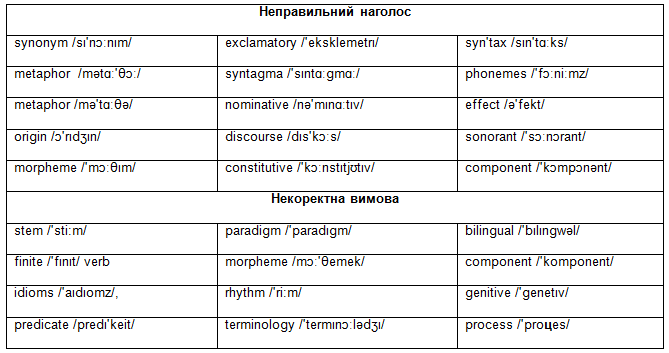 1. Неправильна вимова студентами широковживаних лексичних одиниць і фонологічних термінів:
