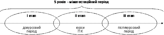 Усі ці вимоги спонукали до створення системи вивчення професійних запитів педагогів у міжатестаційний період. Тобто мова йде про таку систему, яка б охоплювала докурсовий період (І етап), період курсів підвищення кваліфікації (ІІ етап) і післякурсовий період (ІІІ етап) (рис. 1).