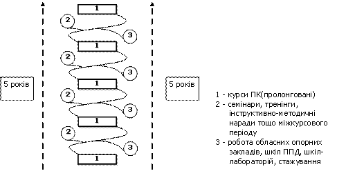 Підвищення кваліфікації і супровід суб'єкта професійної діяльності у міжкурсовий період здійснюється на основі реалізації комплексу взаємопов'язаних організаційно-педагогічних, науково-методичних, дослідно-експериментальних і соціальних заходів, що передбачає як шкільний та районний рівні (семінари, тренінги, інструктивно-методичні наради, методичні об'єднання), так і заходи обласного і всеукраїнського рівнів (робота обласних опорних закладів освіти, шкіл передового педагогічного досвіду, шкіл-лабораторій; проведення стажування, авторських курсів (семінарів); написання авторських програм, посібників, підручників тощо).