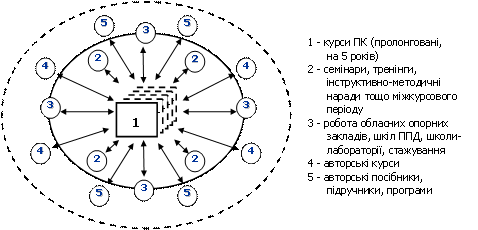 Нові вимоги, що ставить перед освітою суспільство, спонукають до пошуку таких форм роботи з педагогом, які забезпечували б безперервність процесу професійного зростання та освіти вчителя, а саме: розробку й запровадження нової концепції підвищення кваліфікації педагогів на засадах диференційованого підходу, в основі якої – складна (багатовимірна) модель організації підвищення кваліфікації (рис. 3), що супроводжується системою семінарів, тренінгів, інструктивно-методичних нарад, які є логічним продовженням змісту навчання педагогів під час курсового підвищення кваліфікації.