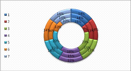 Найменше кільце діаграми відповідає передекспериментальному зрізу на початку 3 класу. Середнє кільце відповідає контрольному зрізу, а найбільше кільце представляє результати післяекспериментального зрізу. Діаграма дає можливість побачити зміни у розподілі показників критеріїв для учнів між зрізами. Як видно на діаграмі, показники контрольного та післяекспериментального зрізів майже співпадають, що пояснюється невеликим проміжком часу між цими зрізами. Вирівнювання у розподілі оцінних коефіцієнтів критеріїв свідчить про рівномірність розподілу навантаження в окремих завданнях.