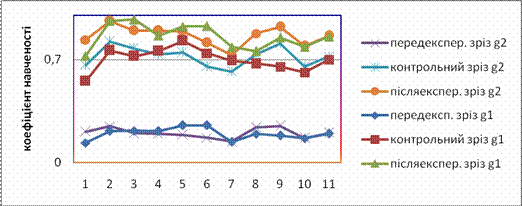 Рис. 9. Порівняльний графік динаміки росту коефіцієнта навченості у зрізах по групах