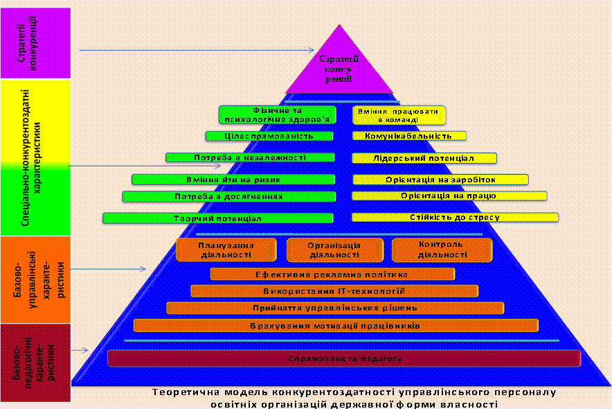 Щодо порядку розташування всіх вищенаведених характеристик, включених до теоретичної моделі конкурентоздатності управлінського персоналу освітніх організацій державної форми власності, зазначаємо, що чим вищу позицію займають характеристики у піраміді (рис. 1), тим більше значення вони мають у представленій структурі і тим важче досягти високого рівня їх розвитку.