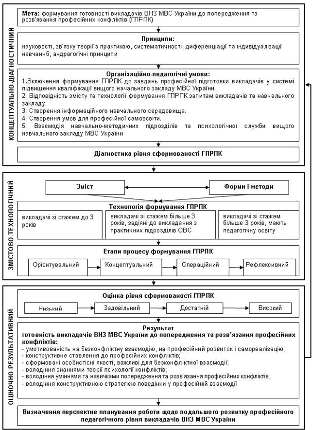 Виклад основного матеріалу. Розробляючи модель формування готовності викладачів ВНЗ МВС України до попередження та розв’язання професійних конфліктів, використовували провідні ідеї теорії педагогічної діяльності, професійної готовності до педагогічної діяльності, концепції підвищення кваліфікації, а також теорії розвитку особистості.