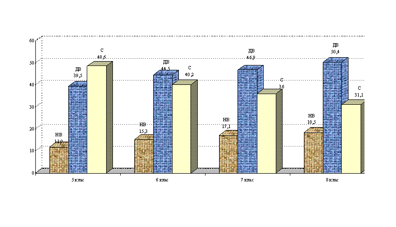 Експериментальне навчання також показало, що існує різниця між рівнями розвитку різних компонентів інтелектуально-творчих здібностей в учнів 5 класів (здатності до евристичного пошуку, гіпотетичності й дивергентності мислення – та уміння мислити художніми образами, уявляти і фантазувати). Інтервал даних у цих класах складає 5-21% високої якості й 28-54% достатньої. Як видно з рис.1, якісні показники комплексного розвитку інтелектуально-творчих здібностей в учнів 5-8 класів помітно зросли. В учнів 8 класів інтервал показників високої якості виконання зазначених завдань складає 14-24,3%, достатньої – 42-58,9%.